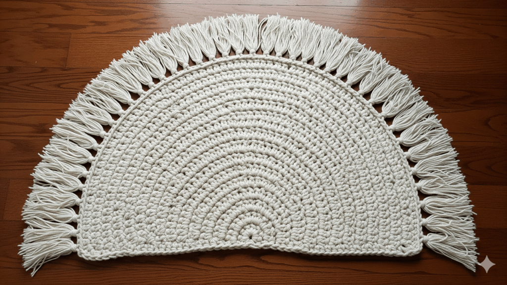 Neste artigo, você vai aprender a criar um tapete meia lua com franjas em crochê, desde o início até o acabamento final. É uma ótima opção para quem está no nível iniciante, intermediário ou já atua com crochê decorativo para ambientes pequenos ou médios. “Tenho mais de oito anos de prática com crochê para casa e já confeccionei diversos modelos de tapetes meia lua para entradas de quartos e cozinhas.“