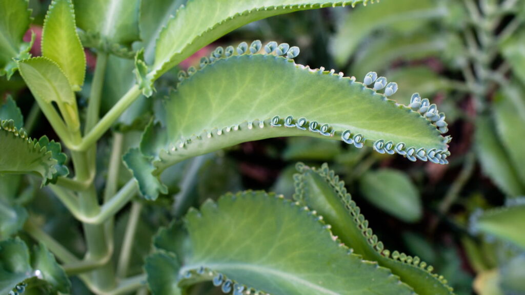 Após algumas semanas, pequenas raízes e brotos começam a surgir junto à base da folha, indicando o sucesso da multiplicação vegetativa.