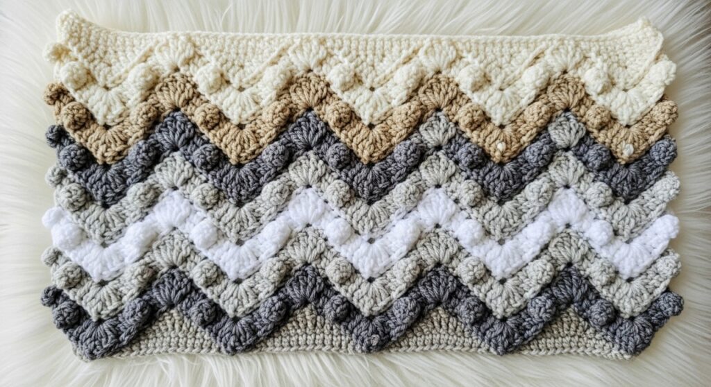 O chevron com pontos pipoca em crochê é moderno, aconchegante e criativo, encantando na decoração.