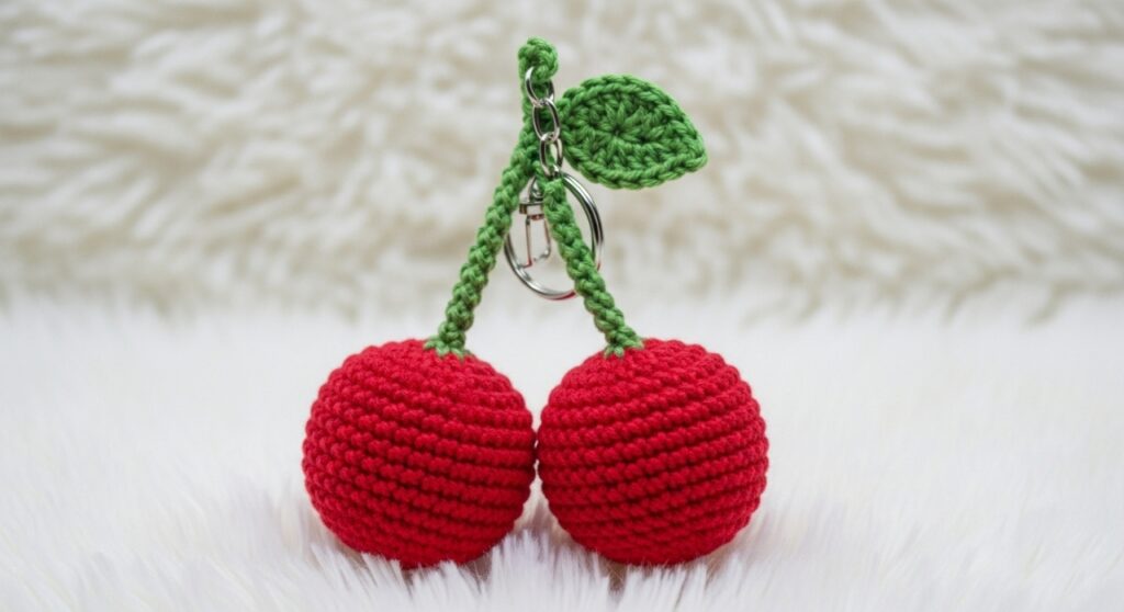 Faça duas esferas vermelhas em ponto baixo, preencha com enchimento, confeccione caule e folhas em fio verde, una todas as partes com costura firme, prenda em argola ou cordão e finalize com arremates escondidos para acabamento seguro.