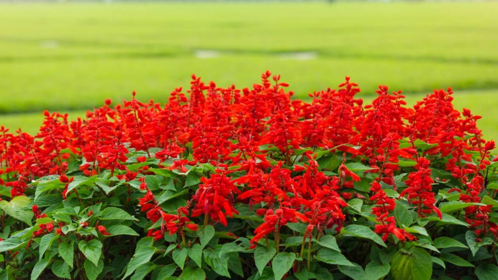 A sálvia vermelha (Salvia splendens) é conhecida por suas flores compridas e cheias de néctar, que os beija-flores adoram. O formato da flor facilita a alimentação dessas aves, tornando a planta ideal para quem quer ver beija-flores de perto no jardim.